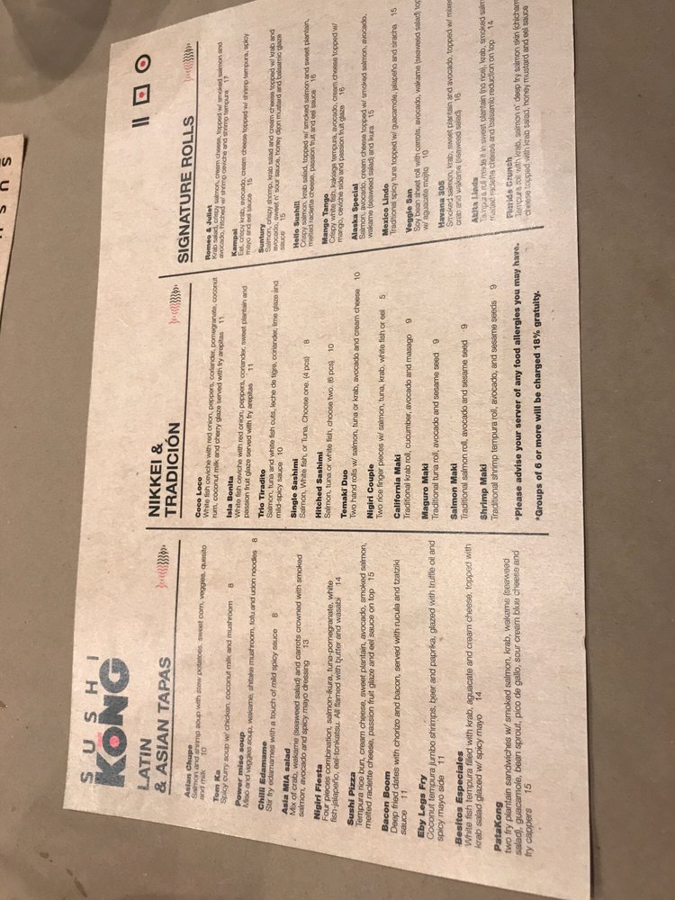 Introducing Sushi KONG, a Japanese - Sushi Bar with a Latin fusion twist located in Coral Gables, FL. This trendy spot offers a diverse menu with signature rolls like the Akita Linda Roll and Alaska Special Roll, Latin and Asian tapas such as Asia Mia Salad and Bacon Boom, as well as Nikkei and Tradicion dishes like Avocado Maki and Coco Loco. Customers rave about the flavorful sushi options and unique combinations, with standout dishes like the Eel Nigiri and Georgina Roll receiving high praise. The ambiance is described as relaxing, with attentive service and delicious desserts like fried cheesecake. Whether dining in or ordering takeout, Sushi KONG promises a memorable culinary experience with a blend of traditional and innovative flavors.